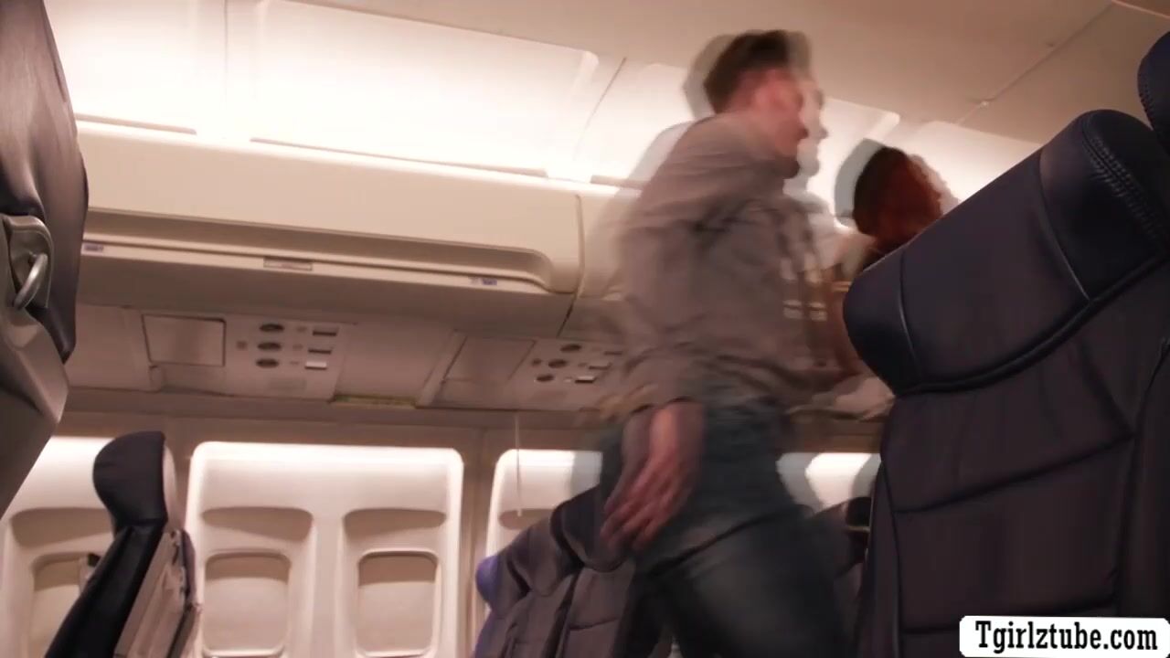 Horny TS flight attendant lets her chubby passenger suck her hard shecock in the plane.After that,she fucks her pussy so deep and hard.Next is,she grabs the guy on his seat and brings him into the comfort room and do threesome sex.
