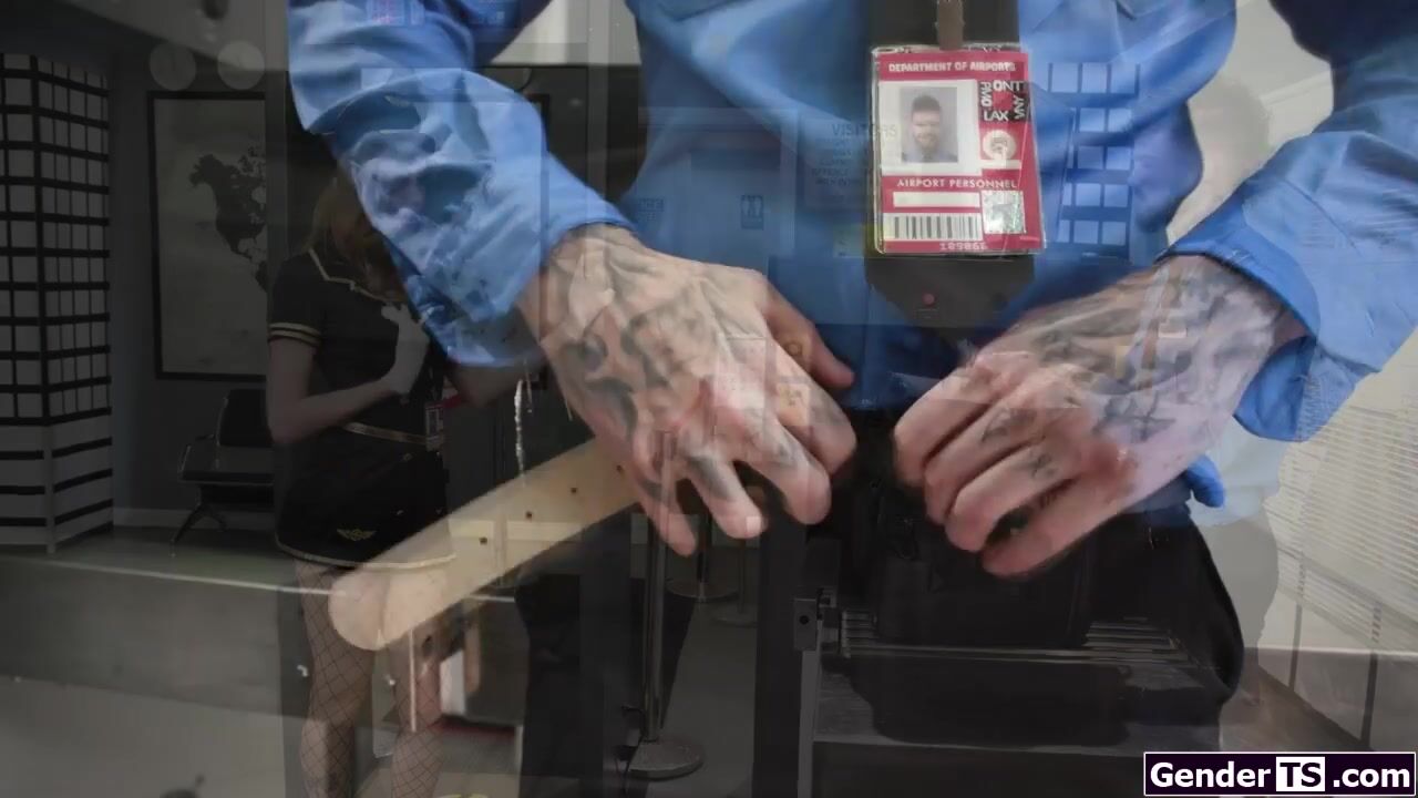 Busty shemale flight attendant sees her metal anal toys get confiscated by customs officer and wants something in return.The guy takes out his dick and lets the big tits tgirl suck it off.He deepthroats her tranny dick and anal barebacks the trans
