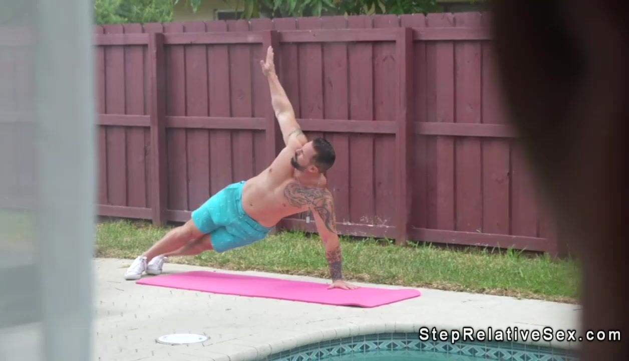 Brunette teen Violet Gems gets horny while watching her shaped stepuncle GI Joey workout in backyard by the pool and then sucks and fucks his big cock in various positions