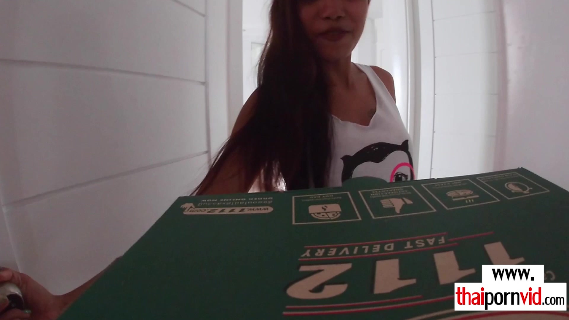 Hot asian girlfriend orders pizza but instead gets a surprise from her european boyfriend He asks her if she wants to eat his dick so she kneels down and sucks his big cock and licks his balls Then he bends her over and hardcore fucks her from behind