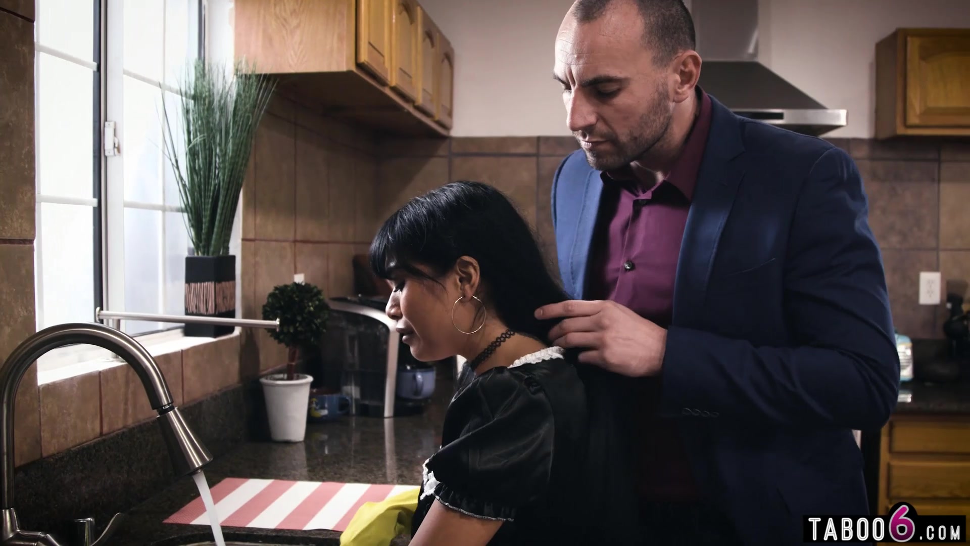 Illegal latina teen maid with big tits Aryana Amatista still got hired by a very strict older guy but with a special arrangment He can do whatever he wants to her while on the job and he takes full advantage of that Jamming his big dick in in the kitchen!