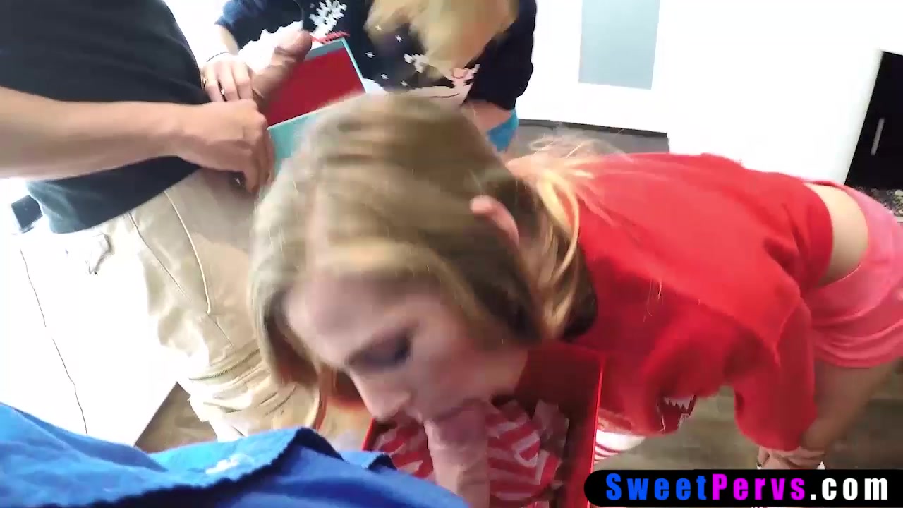 Petite lesbian teens with perfect natural tits get naughty present by dirty santa during they licking each others shaved pussy They get two big cocks what they suck and fuck hard