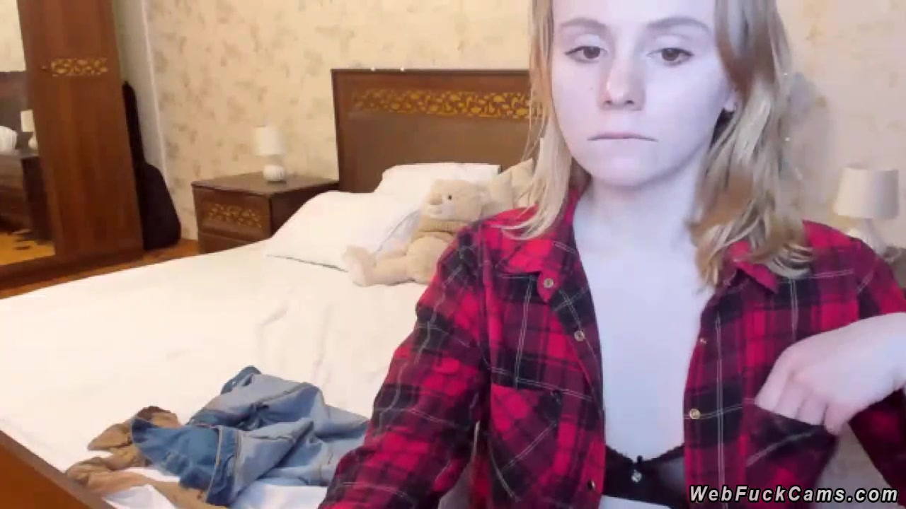 Petite blonde amateur teen in see through black bra chatting in private webcam show then waering shirt and posing in armchair in her bedroom