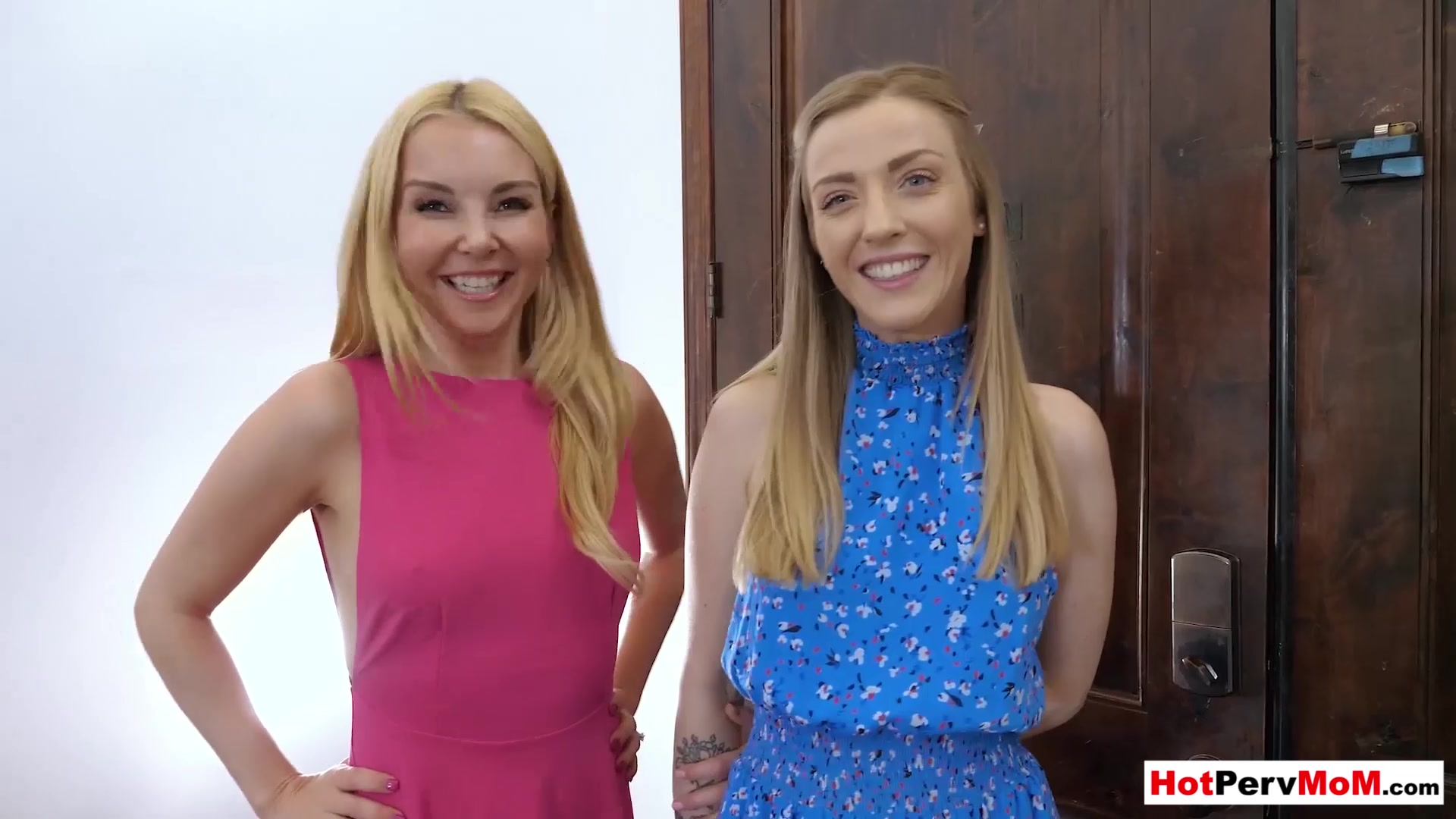 Curious stepson hearing weird noise from his stunning blonde MILF stepmothers Aaliyah Love room so he sneaking in where the cougar slut laying on the bed and eating a petite teens Karla Kush shaved pussy