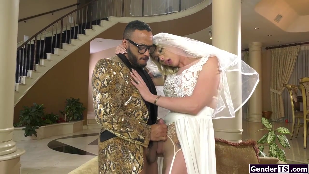Busty blonde Tgirl bride Aubrey Kate is getting hard on her weddingplanner.She lifts up her weddingdress and reveils her hardon.She lets him suck off her big hard cock.After she sucked off his black cock she bareback anal rides on it