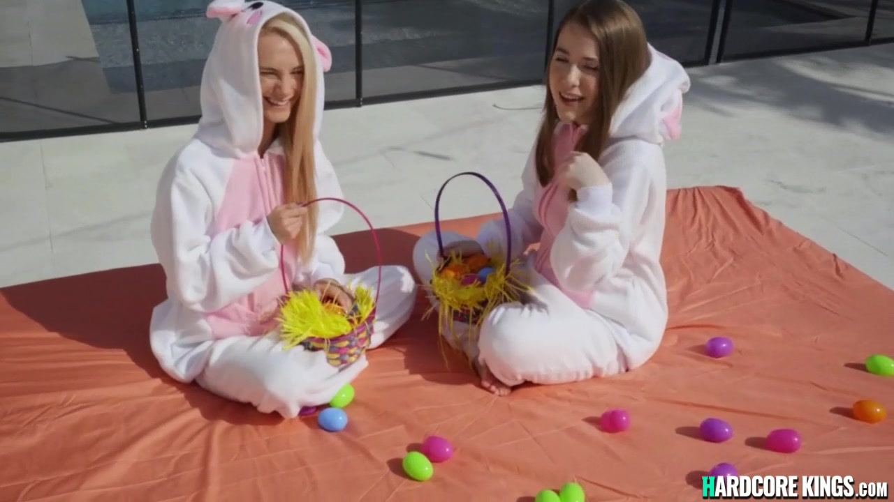 Two petite bunnies Alice Merches and Sadie Hartz playing with eggs on mattress outdoors beside pool and then sucking and fucking huge dick