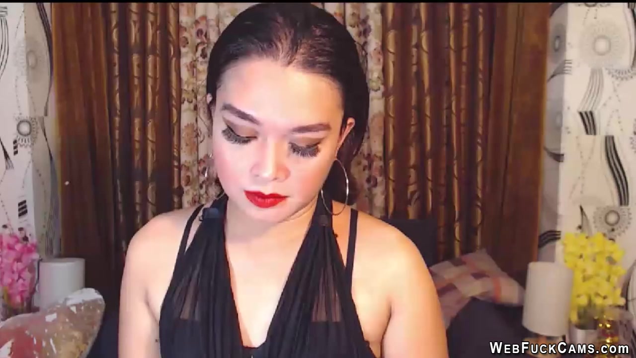 Sexy brunette Asian amateur babe in black outfit with full make up and big ear rings posing and chatting with her users in private webcam show