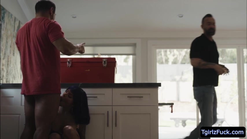 TS Foxxys husband called Plumber Draven. While her husband was busy, She let the Plumber in and checked their Pipes. But when shes staring at the plumbers ass, it turned her on and Puts her Pipe inside the Plumbers Ass. Draven tried to stop her but TS wants more so she followed him to the Bathroom.