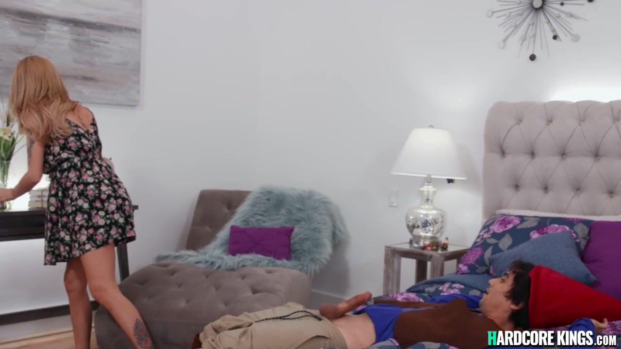 Huge tits blonde MILF Joslyn James is gardening when grabbing new lawn gnome Ricky Spanish for big cock and bringing him in bed for fucking and sucking
