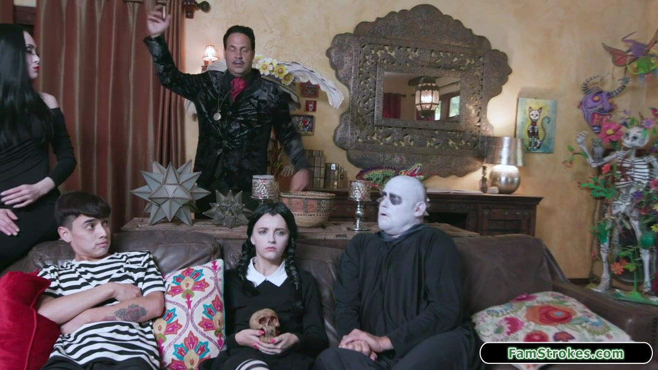 Gomez Addams doesnt like that the rest of the Addams family are secretly fooling around.To the bedroom where Morticia strips and Wednesday sucks Gomez n Pugsley.Soon they all fuck each other.Wednesday licks sucking Morticias pussy while being banged
