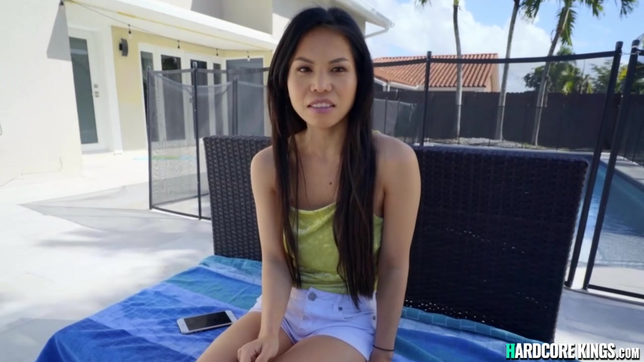Petite small tits brunette Asian hottie Evie Ling meets big dude Jmac at backyard pool and then fucks and sucks his big cock in various positions