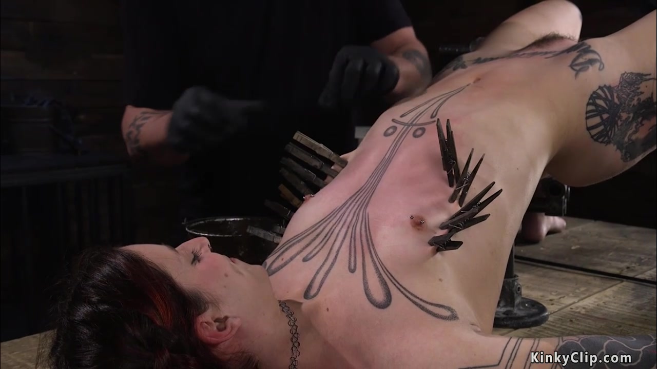 Tattooed hairy pussy brunette slut Cam Damage in device bondage gets whipped and tormented then shaggy twat vibrated by master in dungeon