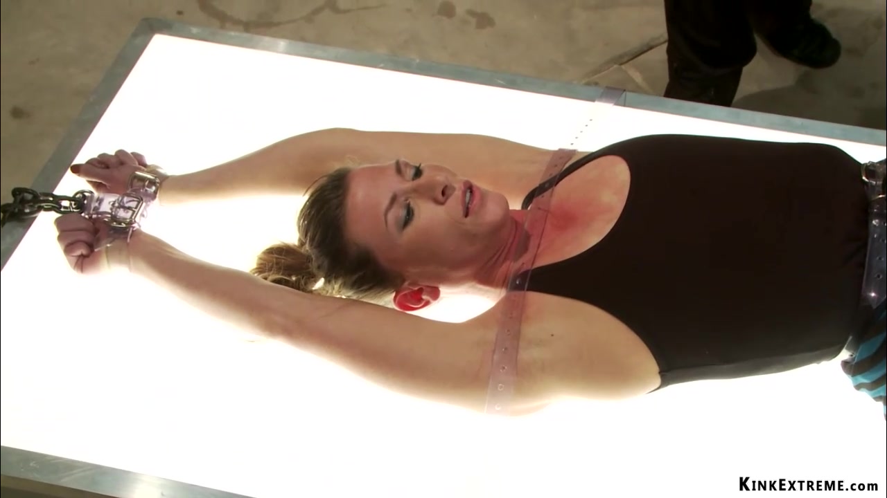 Bound on illuminating table hot brunette slave Ariel X is nipples clamped and feet caned then chained in standing position zippered in Psycho Ward