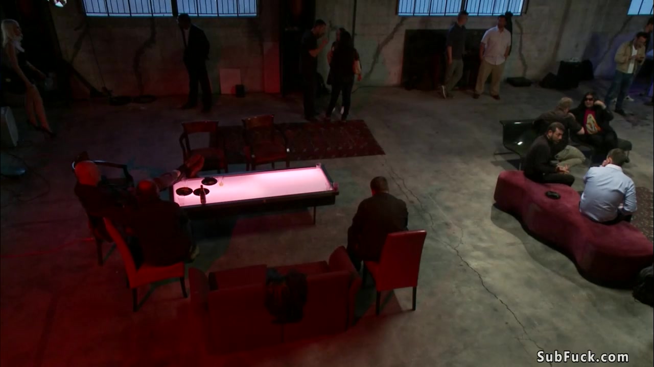 Gagged busty redhead slut Penny Pax is dominated by blonde dom Lorelei Lee and made suck huge cock to master Karlo Karrera who later fucks her in bdsm in public place