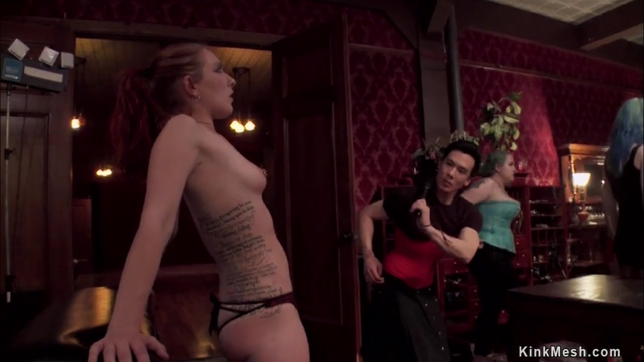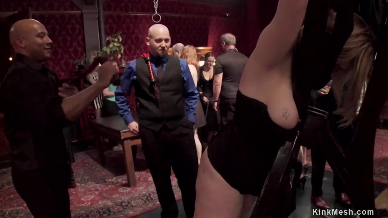 Senior slave Amanda Tate teaches tied hot blonde AJ Applegate suck big cock on her knees while other slut are whipped and tormented at bdsm party in the upper floor