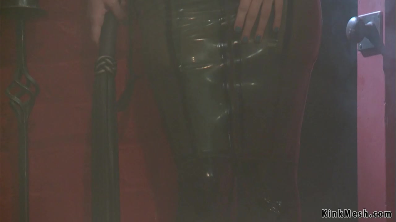 Hot blonde lezdom Cherry Torn in latex stockings makes brunette lesbian Sovereign Syre worship her feet then whips and fucks her pussy with dildo on a stick