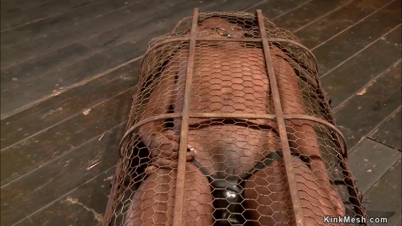 Bound gagged ebony slut Ana Foxxx is drooling while master The Pope rubbing her pussy then in small wire cage gets pussy vibrating on device bondage