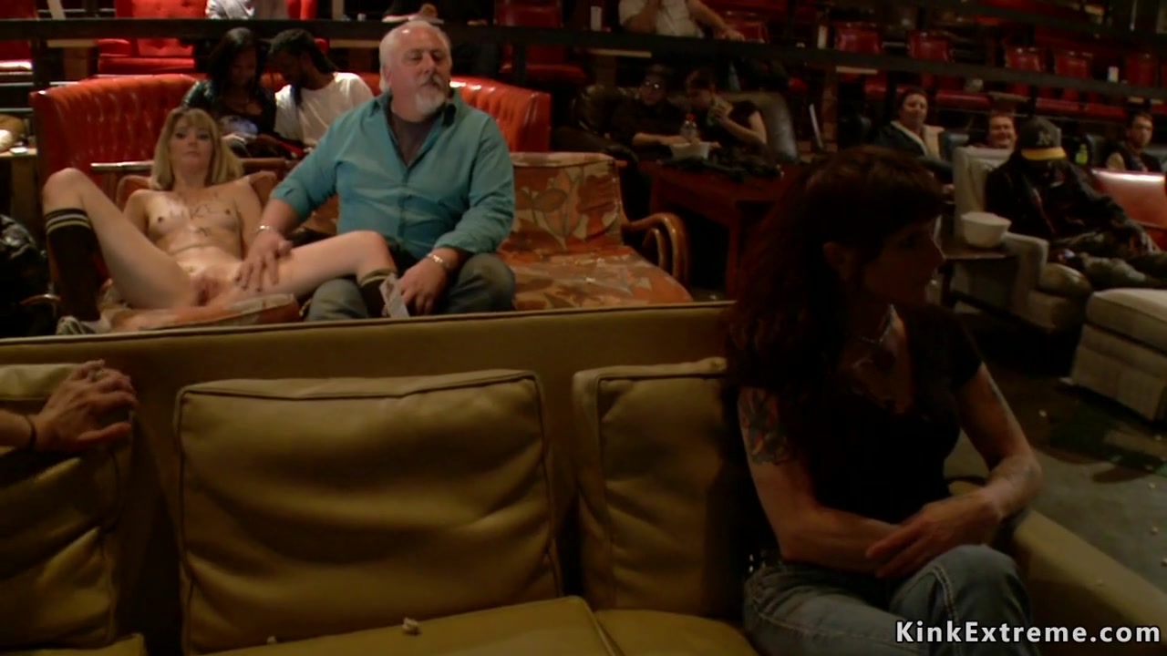 Blonde slave Mona Wales is made by mistress Princess Donna Dolore submit at public adult movies theater and she is groped and rough banged