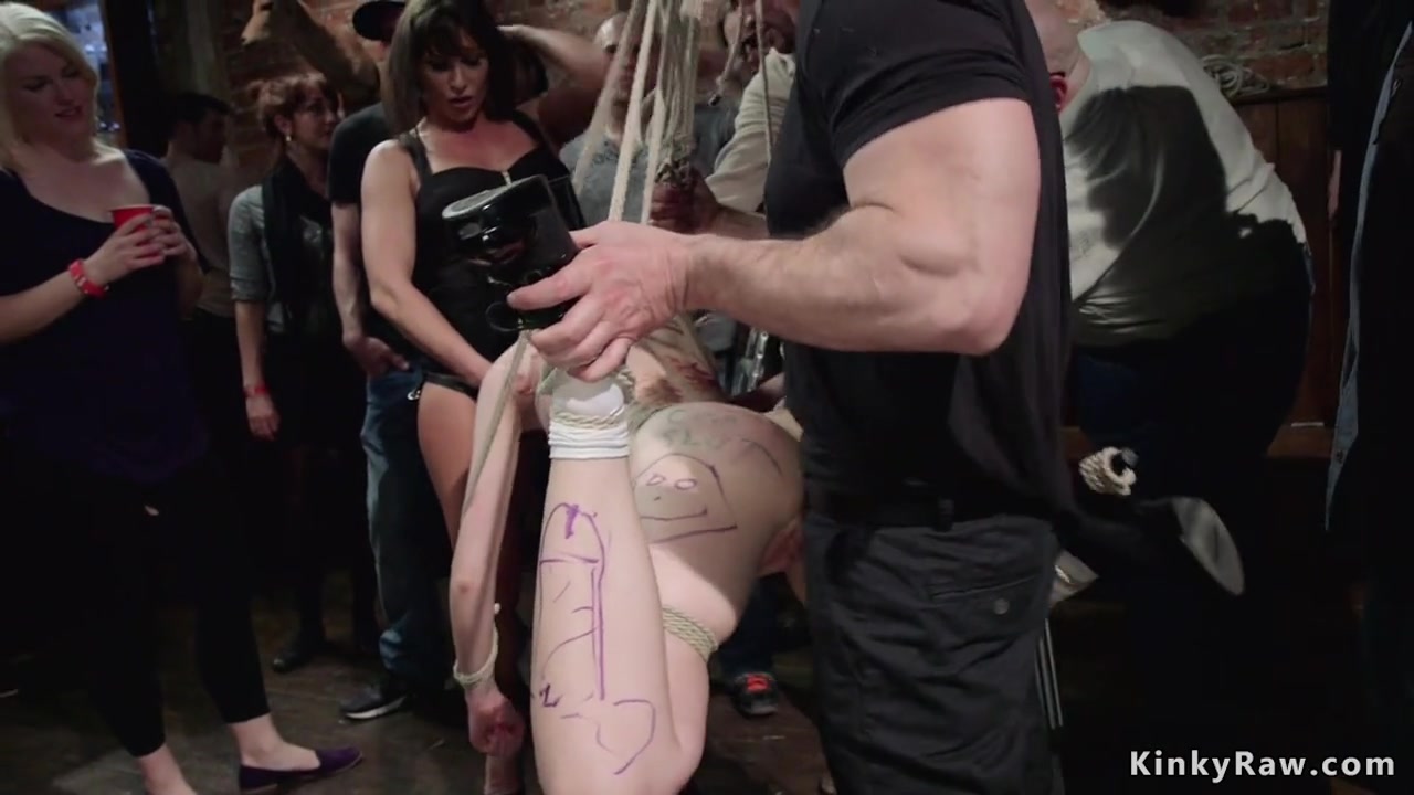 Petite blonde slave Emma Haize is tied in public suspension and fucked by John Strong then lezdom Ariel X joins them and fucks her double penetration