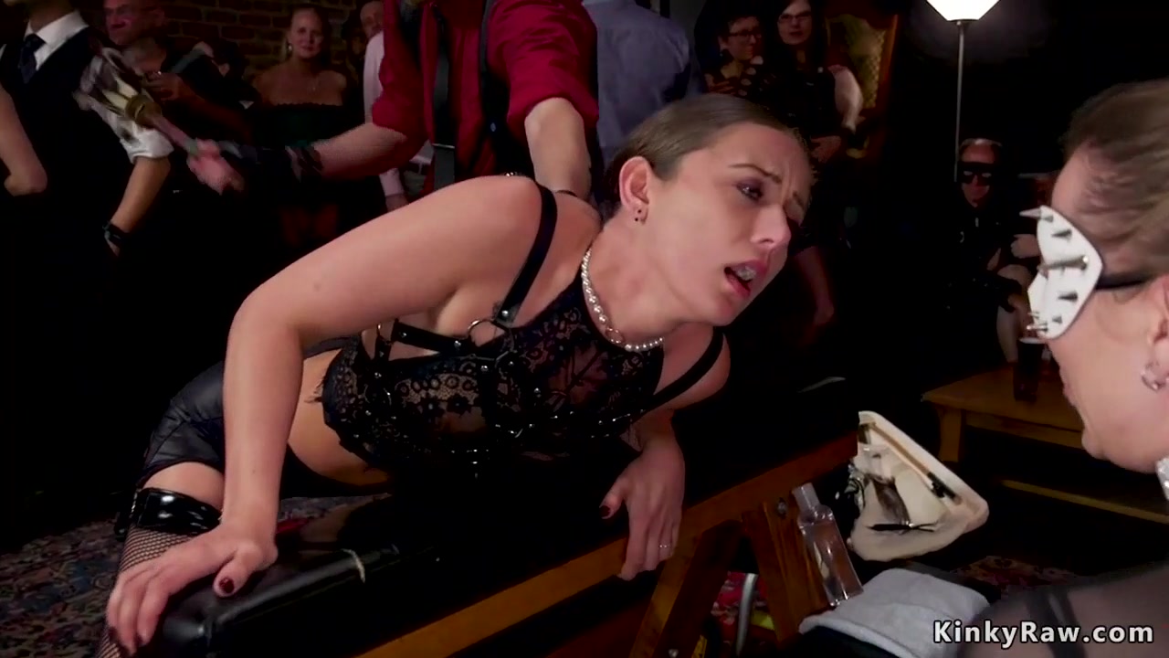 Hot brunette slave in glamorous black lingerie Gia Derza is rough ass whipped then two lesbians licking in bondage at bdsm orgy party