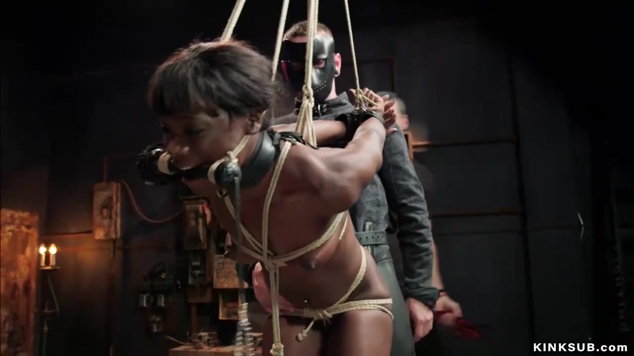 Small tits tied ebony slave trainee Ana Foxxx on knees sucks huge dick to gimp Gage Sin then in strappado banged from behind and whipped by master James Mogul in dungeon threesome