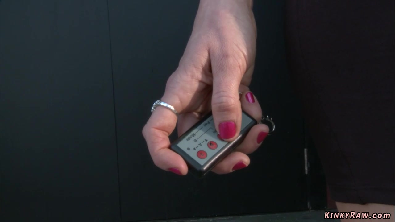 Mistress Lorelei Lee vibrates brunette slave Bianca Stone with remote vibrator outdoors on the streets then at Armory makes her fuck big black cock