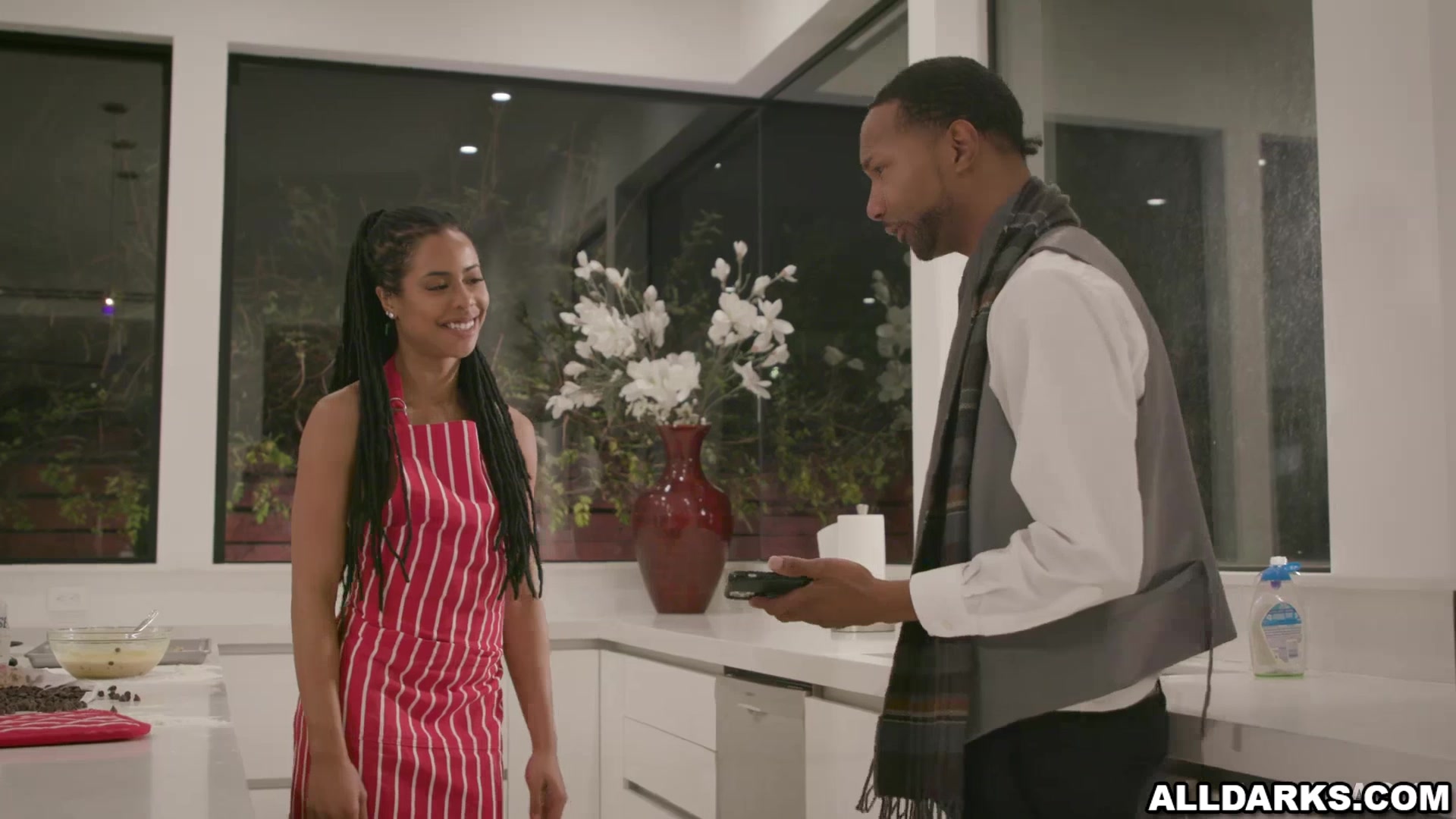 Sexy ebony Kira Noir loves to bake cookies wearing only her apron. Her horny neighbor came in and saw her sexy body and ended up fucking her pussy in the kitchen.