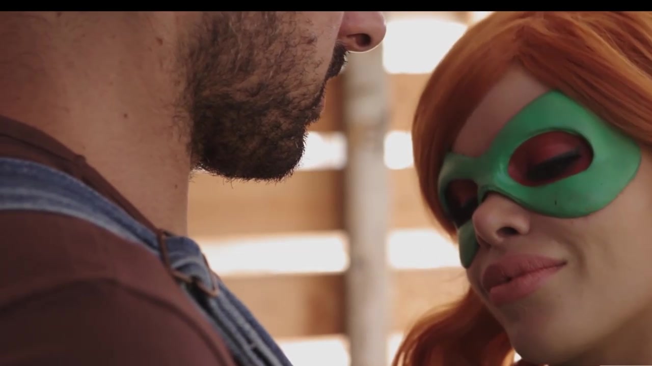 Redhaired pornstar from Justice League XXX parody enjoying outdoor sex with Ryan Driller and Jessa Rhodes