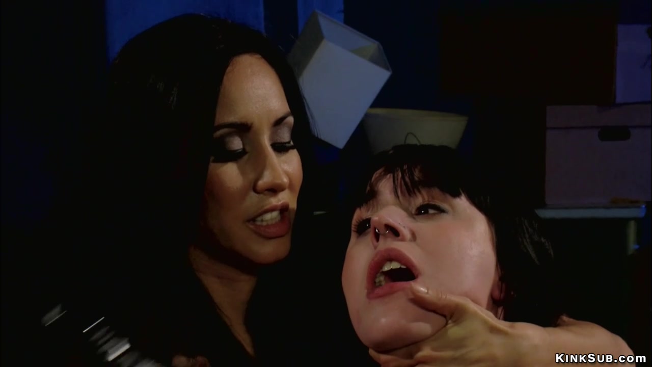 Big boobs brunette lesbian dominatrix Isis Love hard canes brunette slut Katharine Cane in extreme suspension then spanks and anal fucks her with strap on dildo in pile driver position