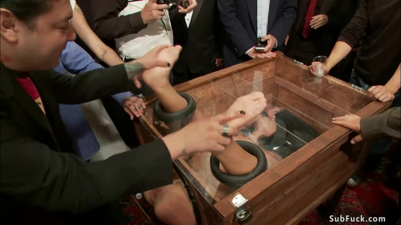 Young brunette slave Adriana Chechik blindfolded locked in glass and wooden box gets fisted by Princess Donna Dolore then fucked by Astral Dust in public