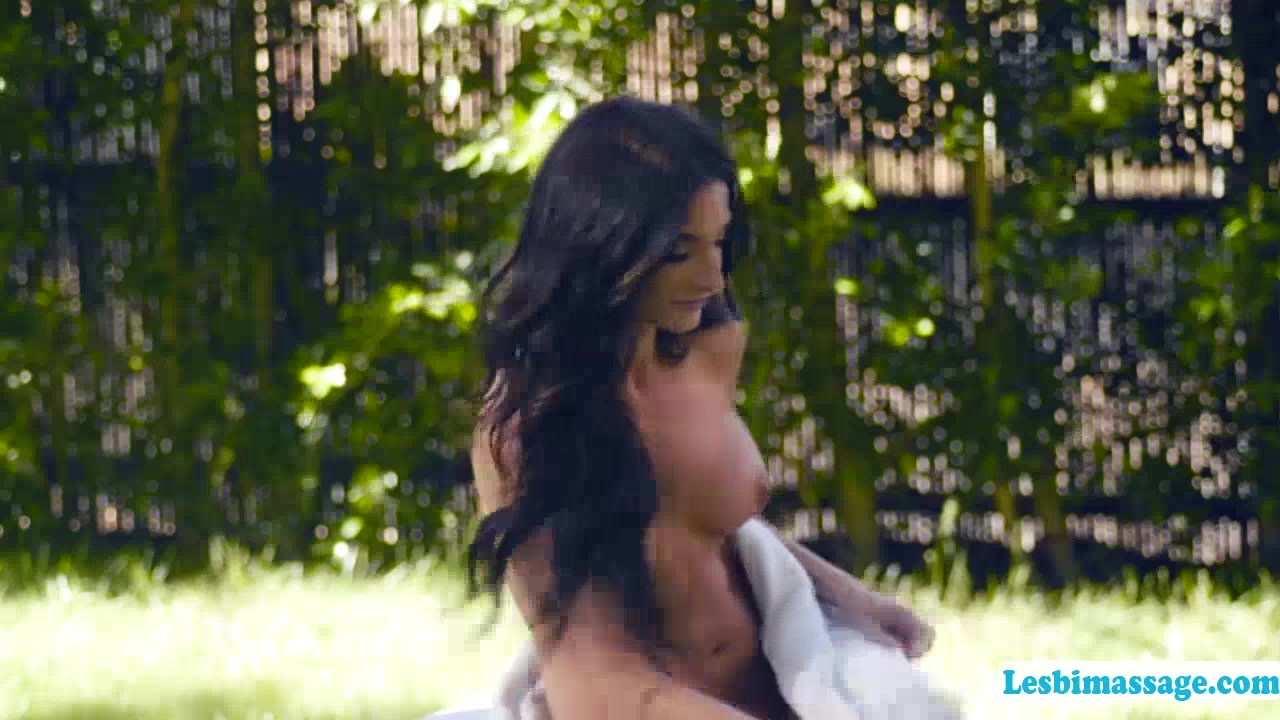 Busty brunette brings her milf friend outside to massage her body.Her milf friend starts removing her clothes and she then sits on her and starts kissing each other.Next is she fingers her friends pussy and she then licks her wet pussy on the table.