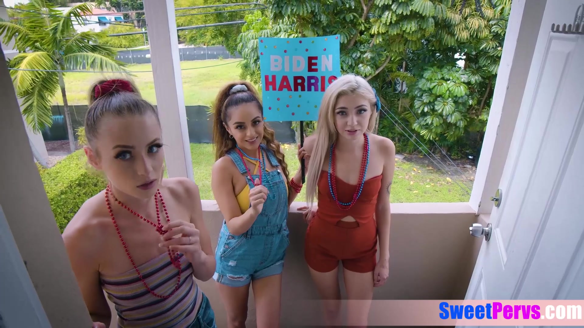 Lesbian teens Sia Lust Nola Exico and Kyler Quinn are going door to door campaigning for the election and they has to fuck a big black cocked conservative to convincing him to vote biden They suck the BBC and fuck him after a hot lesbian show