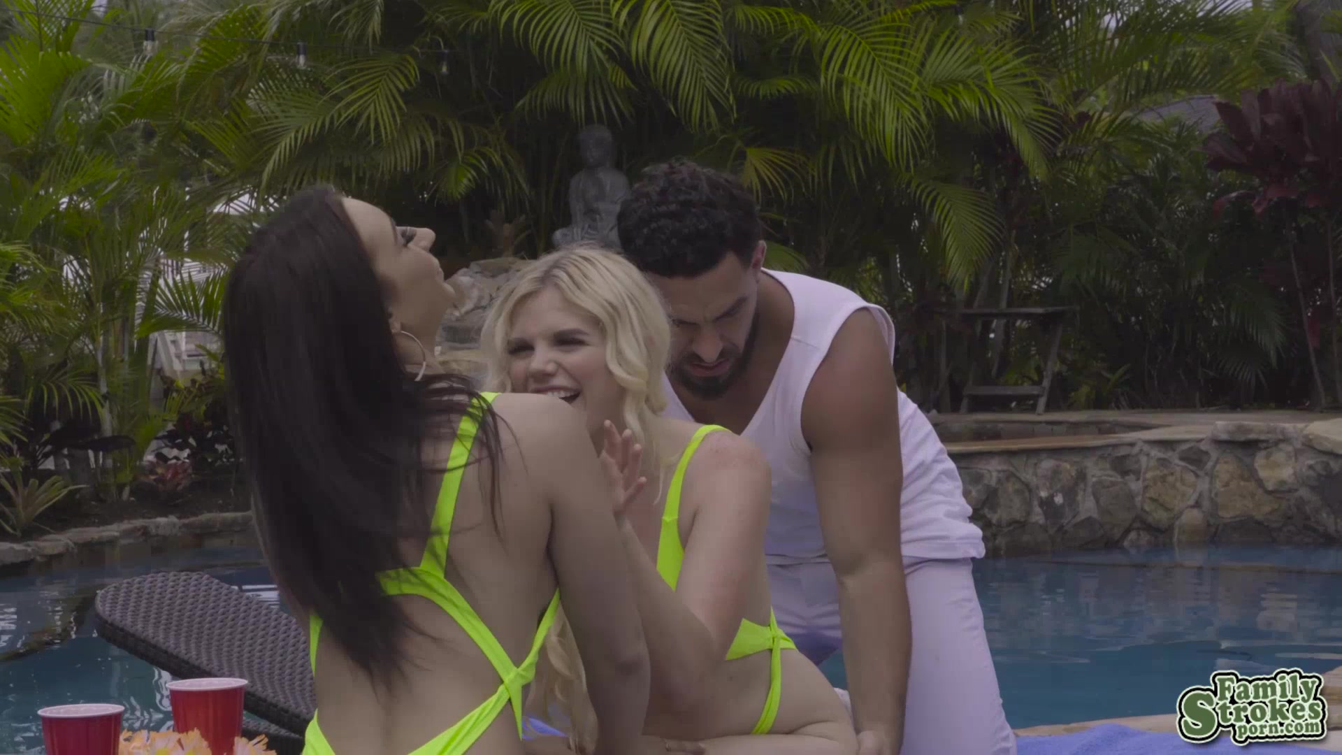 Stepsisters Alessia Luna and Nikki Sweet are having a great time by the pool, showing off their sexy bodies in bikinis! They both get horny and invite over their friend Peter Green to share his fat cock in an awesome pool threesome where the two sisters get their cunts fucked and licked!