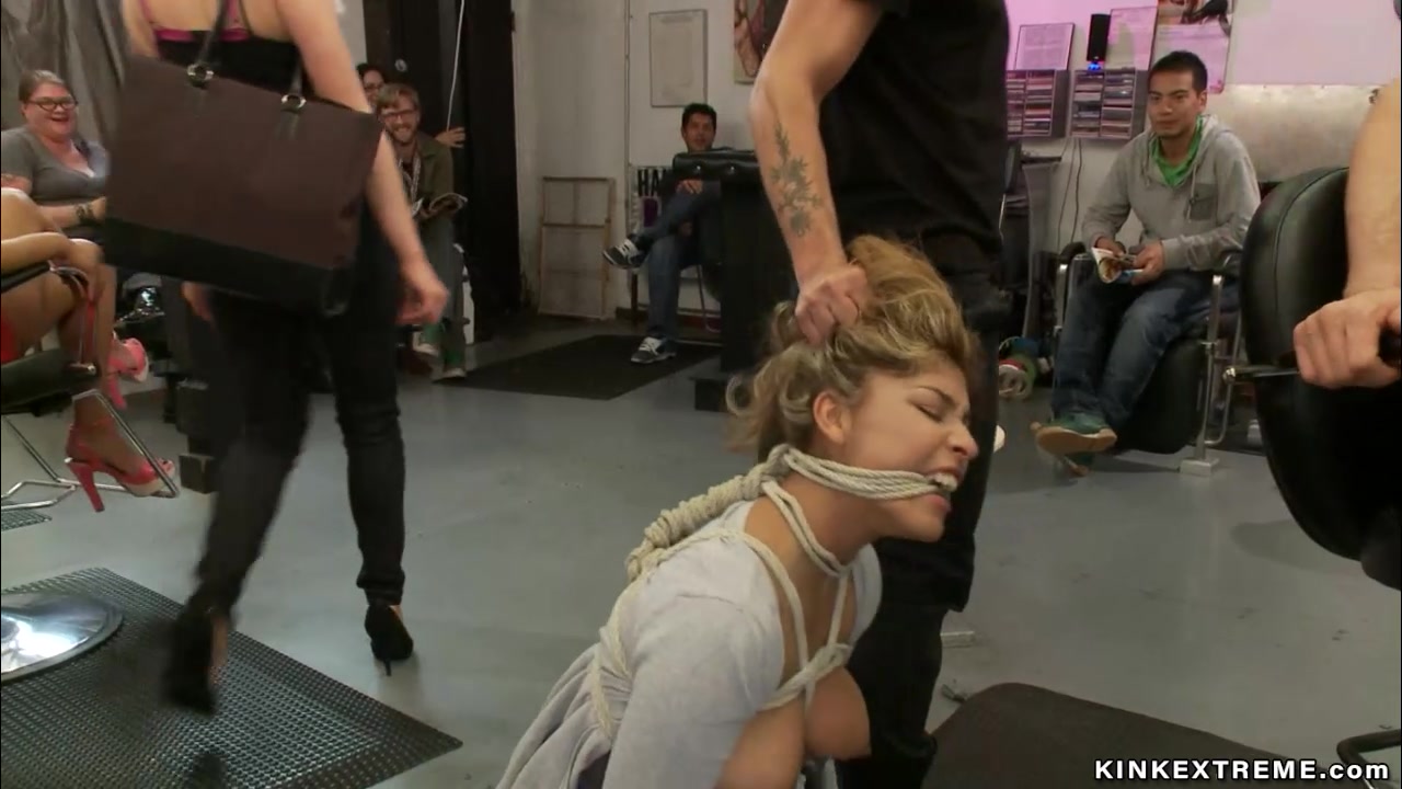 Bound blonde Latina slave Laurie Vargus is spanked and zappered by Lorelei Lee and Mr Pete then deep throat and rough fucked at public hairessers