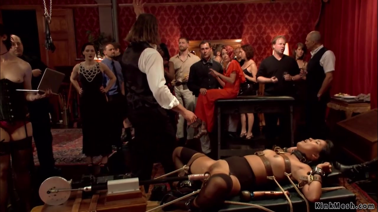 Alpha slave Veruca James talking with strapped Asian slave Angelina Chung while fucking machine then both are fucking big cock at the Upper Floor party