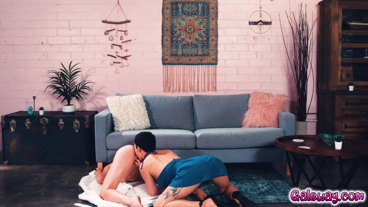 Lacy accidentally drops the ring and it rolls under the couch, so she's quick to drop to her hands and knees to poke around. As she does, she becomes stuck, and the robe she's wearing falls open. When Olive returns she saw Lacys ass and rub her hand all over Lacys ass and pussy