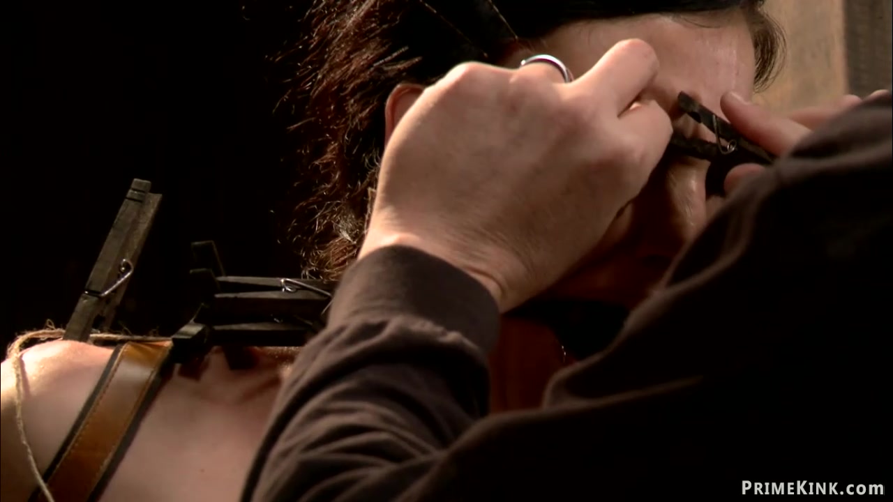 Gagged brunette slave Elise Graves strapped in steel device with back arched gets pussy fingered then set on Sybian in the air gets zipper