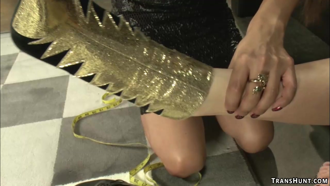 Big ass brunette babe Mandy Muse trying shoes in shop of TS Jessica Fox then sucking her big cock and getting her in pussy and tight asshole