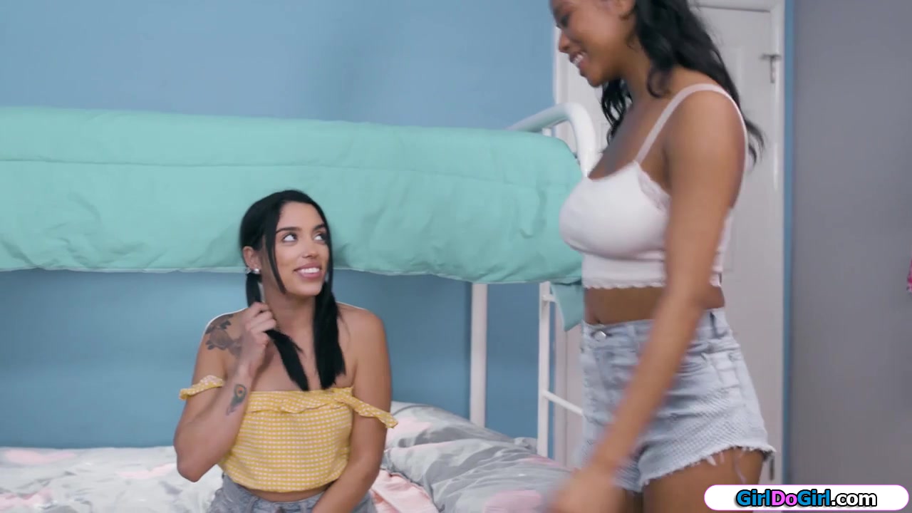 Teen is welcomed by her big tits ebony roommate on her first time at lesbicamp.Shes quite shy but her roommate can teach her all.They kiss and the teen is fingered before she facesits the black girl.Then the ebony facerides her and they masturbate