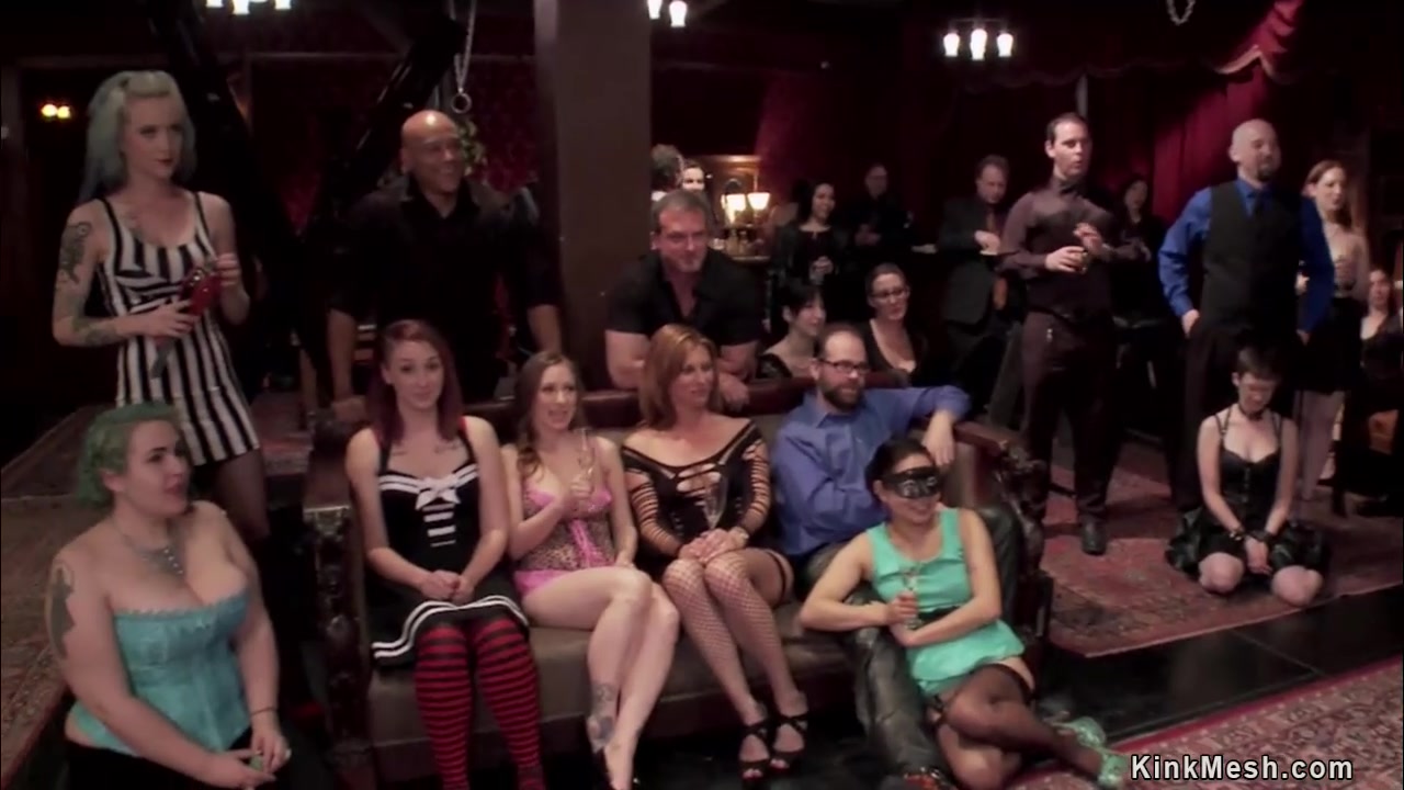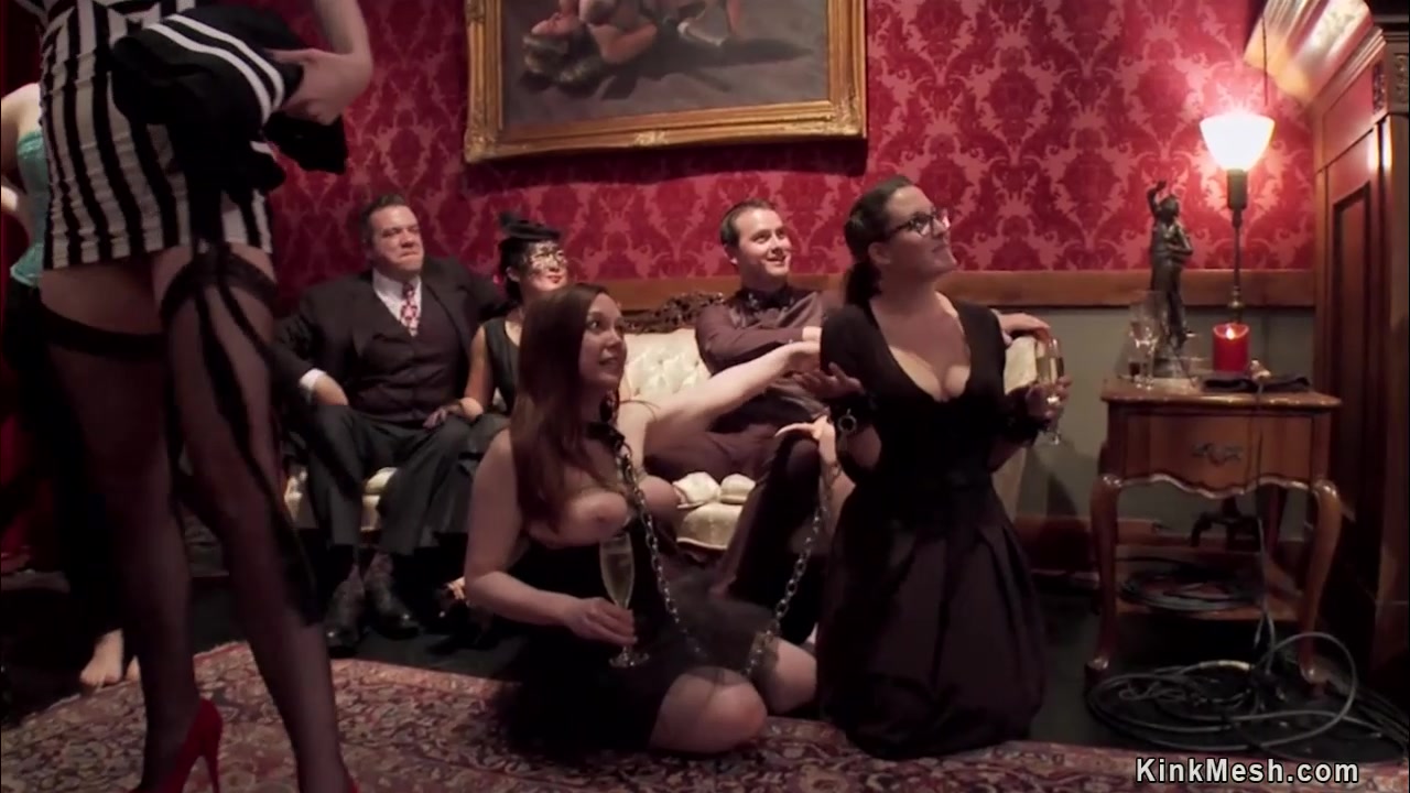 Senior slave Amanda Tate teaches tied hot blonde AJ Applegate service bdsm party and both suck and fuck together with other hotties of upper floor