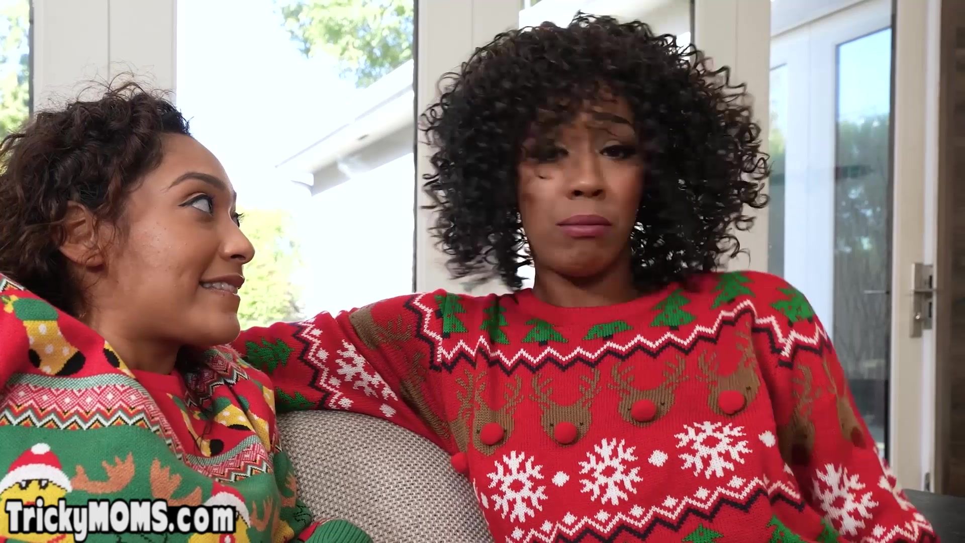 Skinny ebony MILF stepmother Misty Stone with small tits and her petite teen stepdaughter Sarah Lace get a huge dildo for xmas bu they preferring real cocks so mom asks her big white cocked stepson to fuck both of them