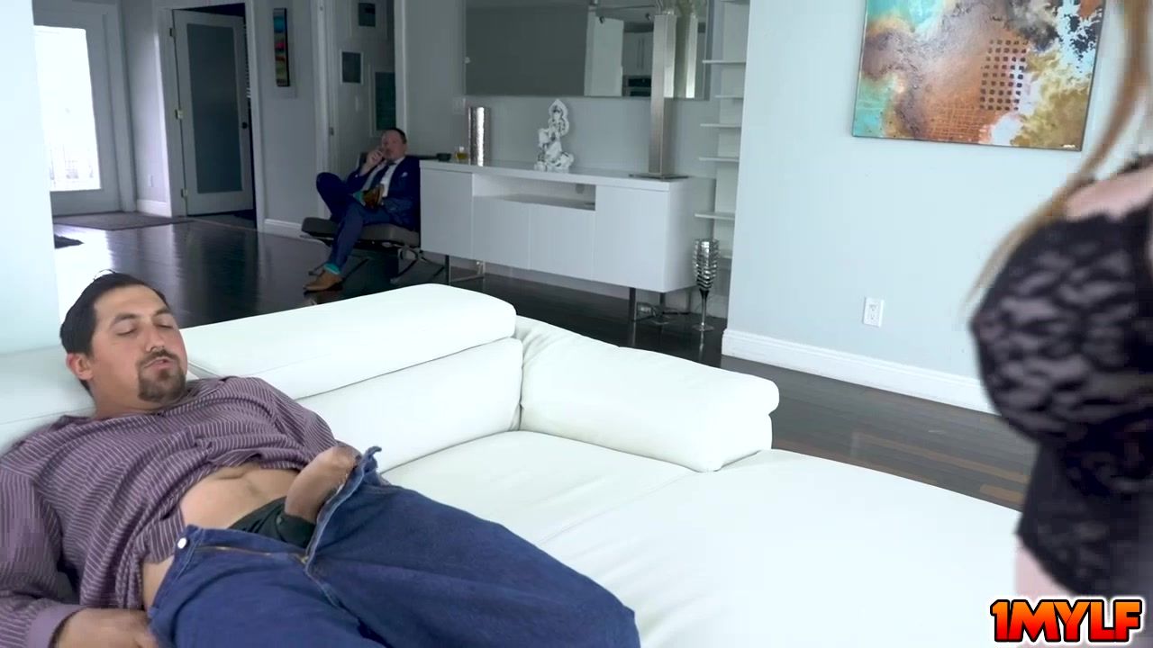 Ginger Babbis husband is sitting right there in the corner ready to watch his wife get pounded out The guy takes the opportunity to stuff his big dick inside the MILFs juicy cunt Her round tits bounce as he strokes inside of her and cums on her face