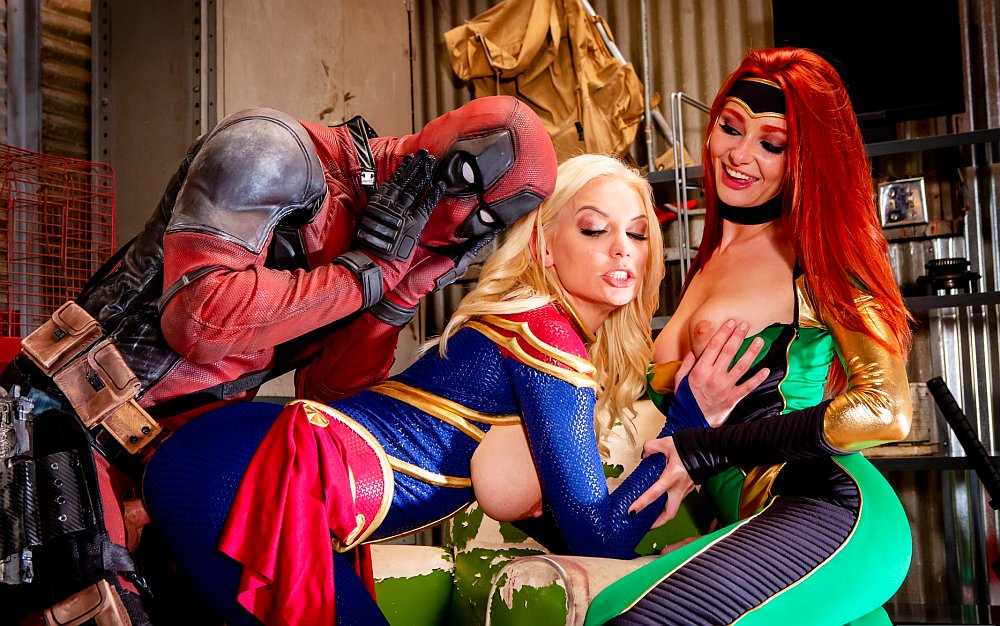 Busty pornstars in Captain Marvel parody sucking a cock of Spiderman with Seth Gamble and Kenzie Taylor
