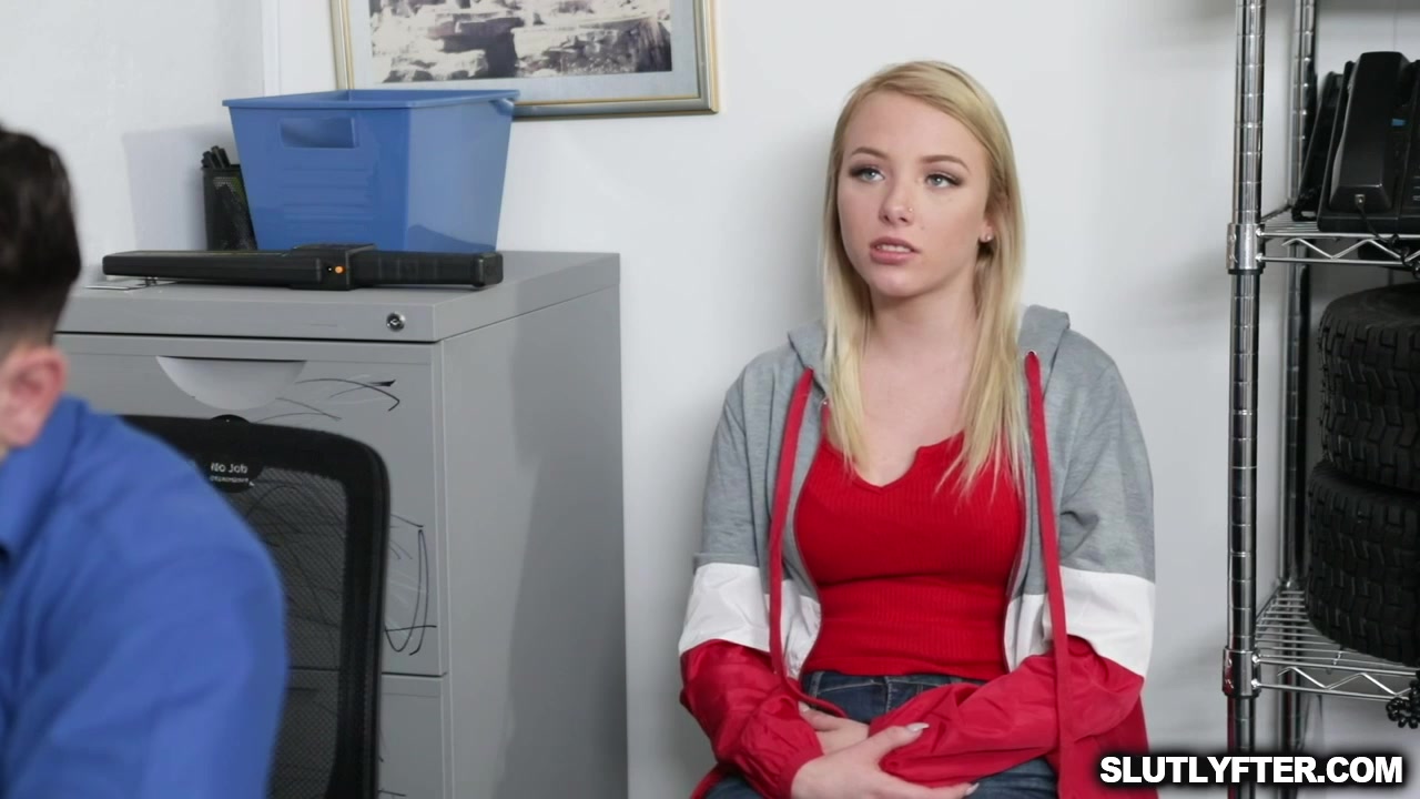 Dixie Lynn is a blonde teen suspect of stealing in store premises. She doesn't want officer Peter Green to call cops so gets on her knees to suck him and then spread her legs wide open so he could bang her in many ways and cums on her pretty face