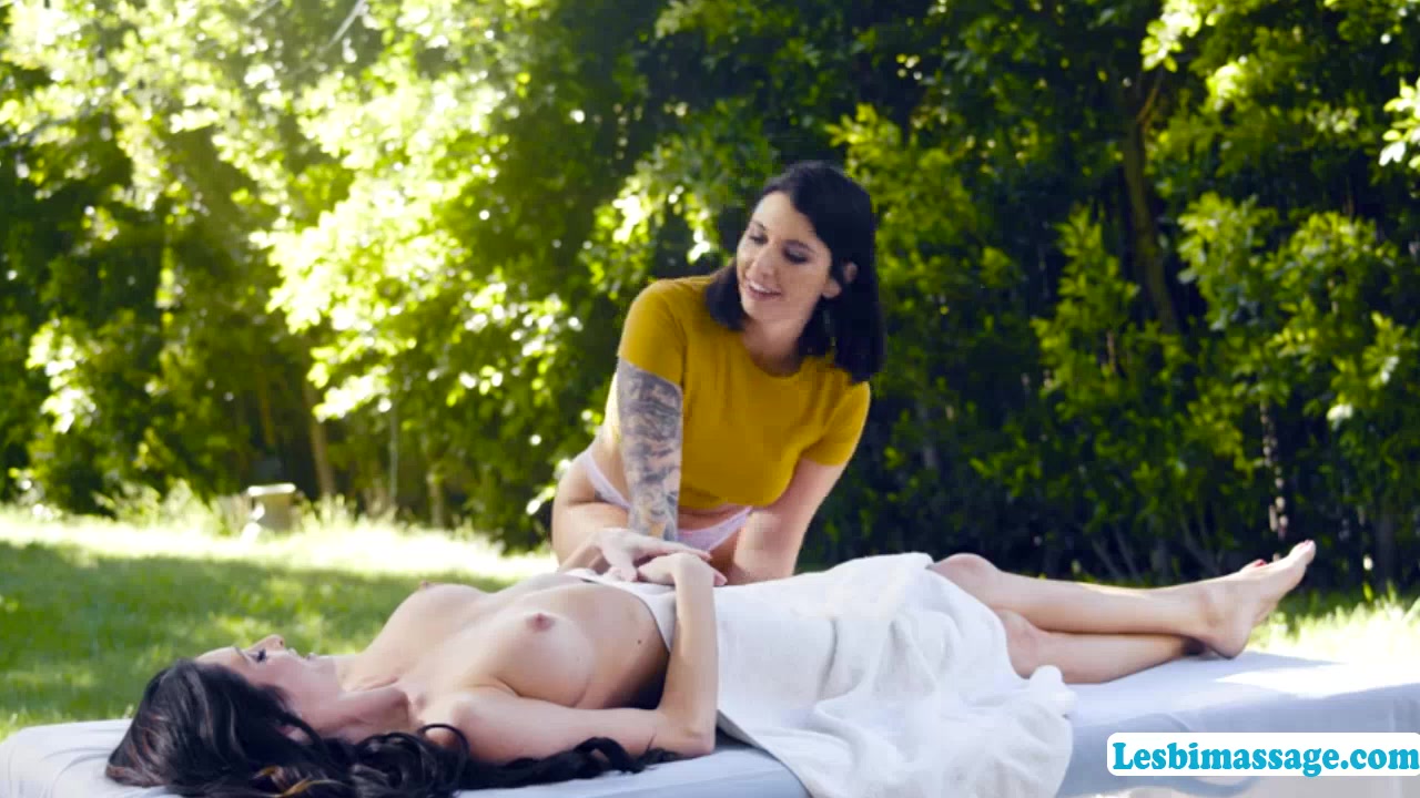 Busty masseuse and her milf customer are outside ready for the massage.The masseuse starts massaging her customer and after that,her customer gets horny and they start kissing each other.Next is they lick their wet pussies on the massage table.