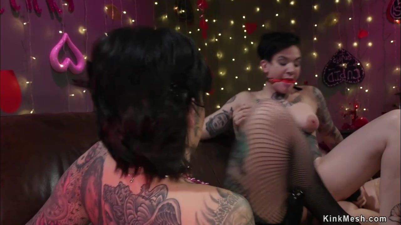 Leigh Raven and Chanel Preston are hosts of Valentines day party and they devour and double penetration fuck alt lesbian Nikki Hearts