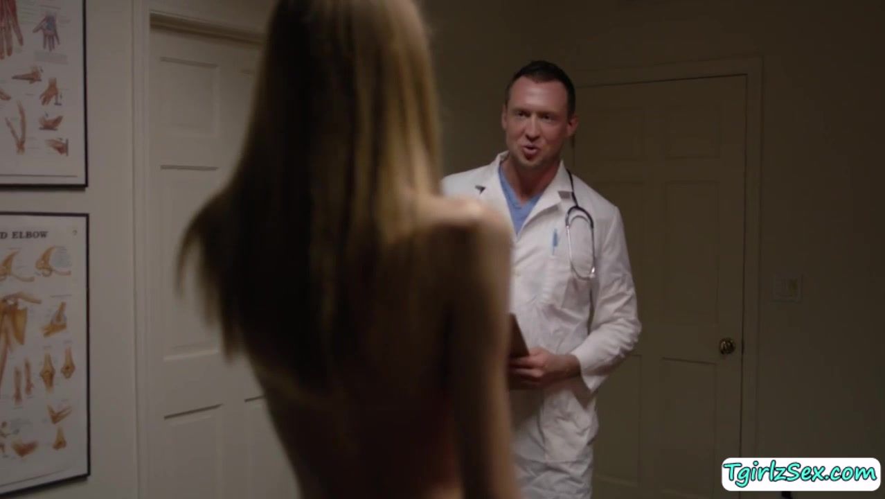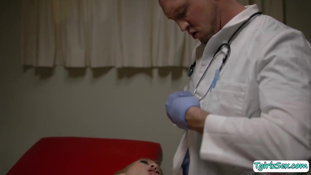 Skinny trans babe is in the doctors office waiting for him to come.After that,they start the check up and the doctor gets horny and start sucking her shecock.In return,she throats his big cock too and lets him fuck her wet ass.