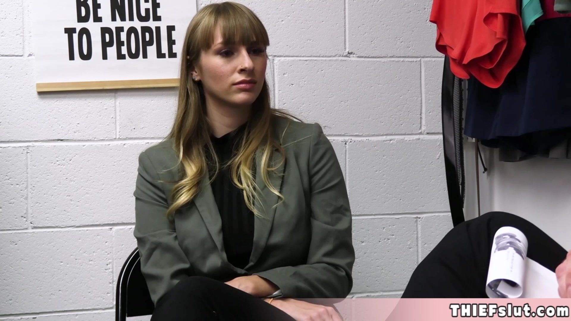 Cute blonde shoplifter with nice natural tits caught and ordered to visit the back room for a quick punish fuck and titjob