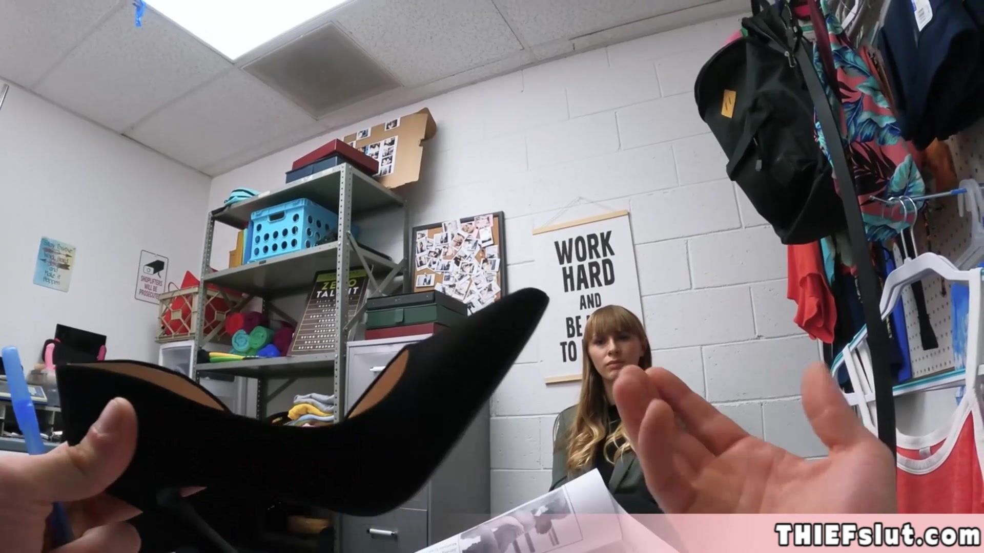 Cute and busty blonde shoplifter tried to steal a pair of high heel shoes They caught her and now its time to pay with that tight teen pussy