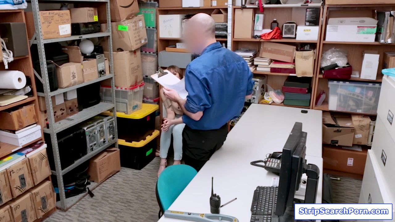 A blonde teen gets caught shoplifting and so she undergoes strip search.The security officer sniffs her lingerie then offers her a way out her sucking his big cock.The big tits babe takes the offer.The guy wants more and fucks her hairy pussy.